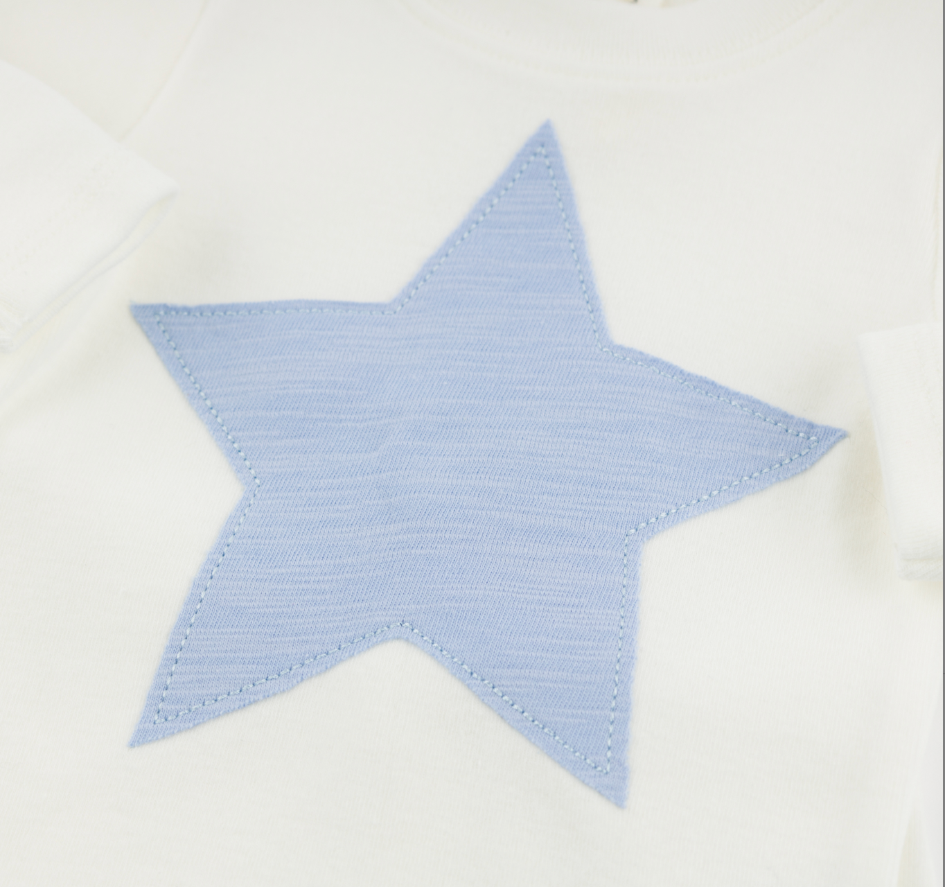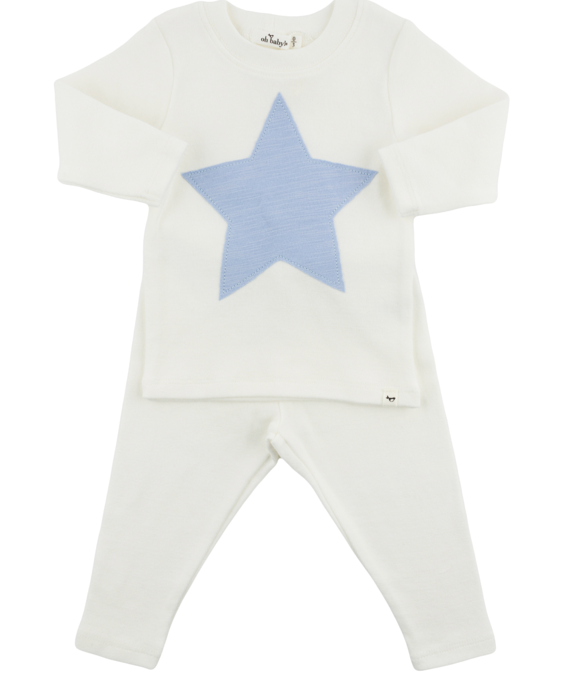 Long sleeve top features a light blue star appliqué; Matching elastic-waist pants are so comfy.