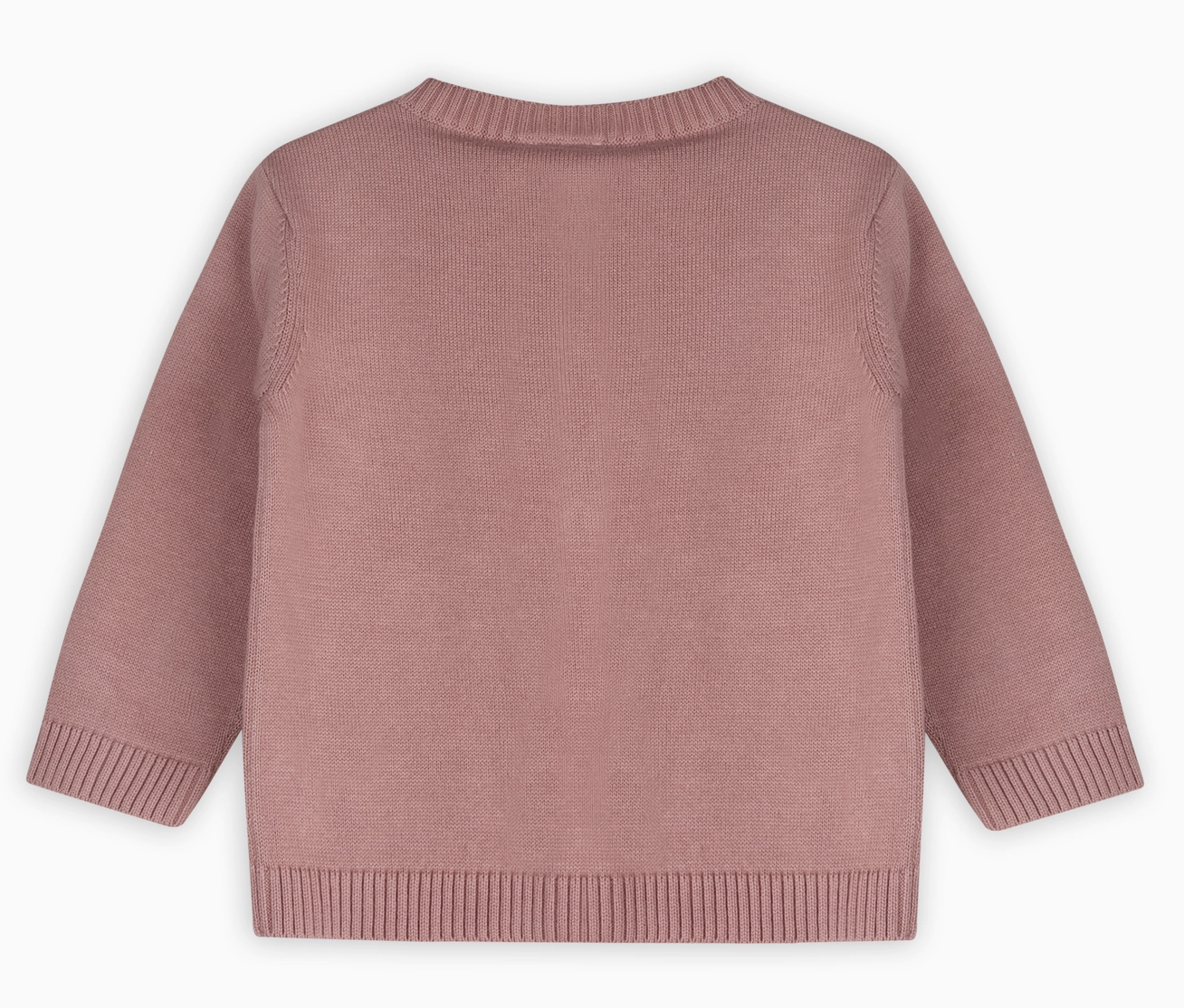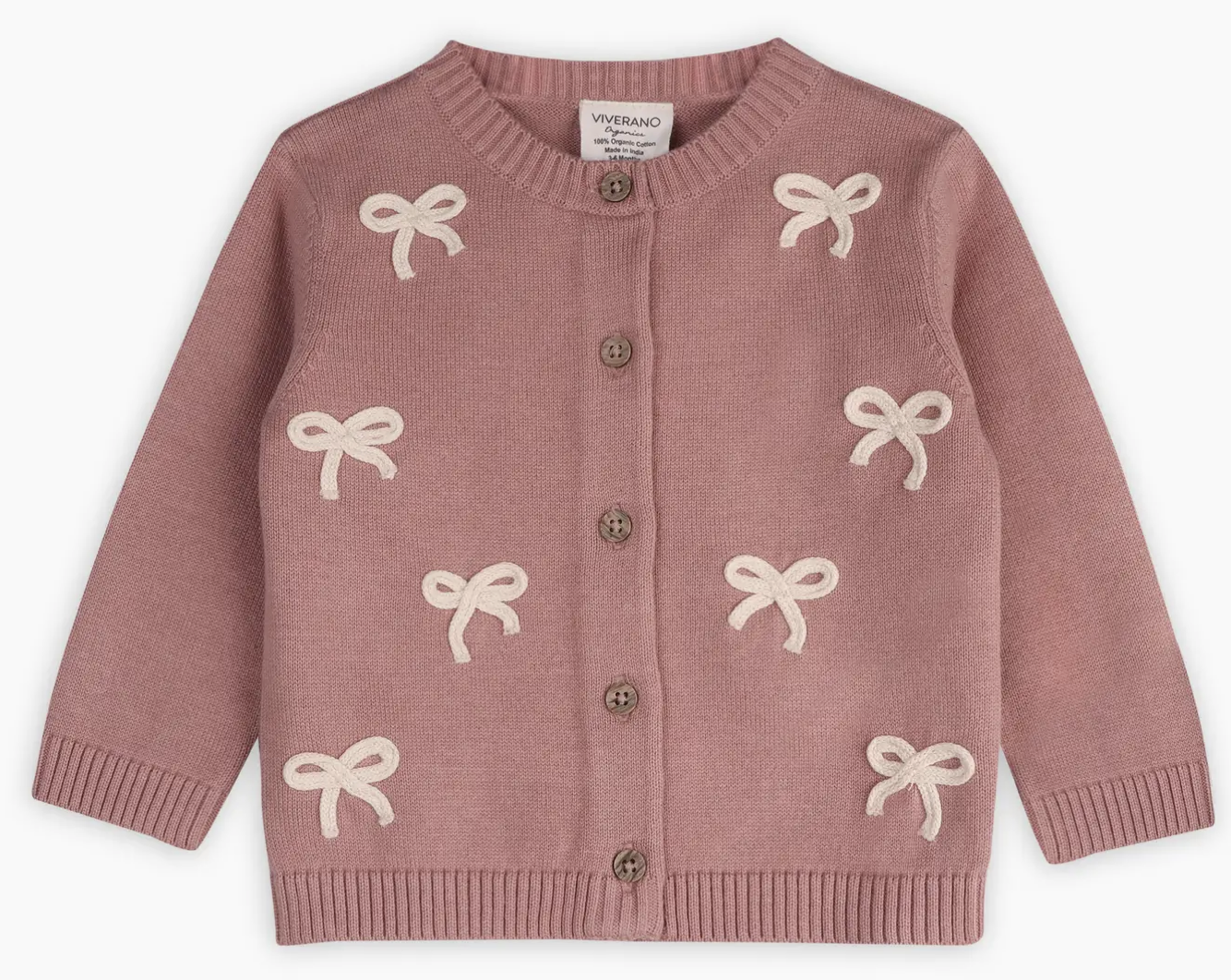 100% Organic Cotton knit long sleeve cardigan with sweet pink embroidery bows and matching knit pants.