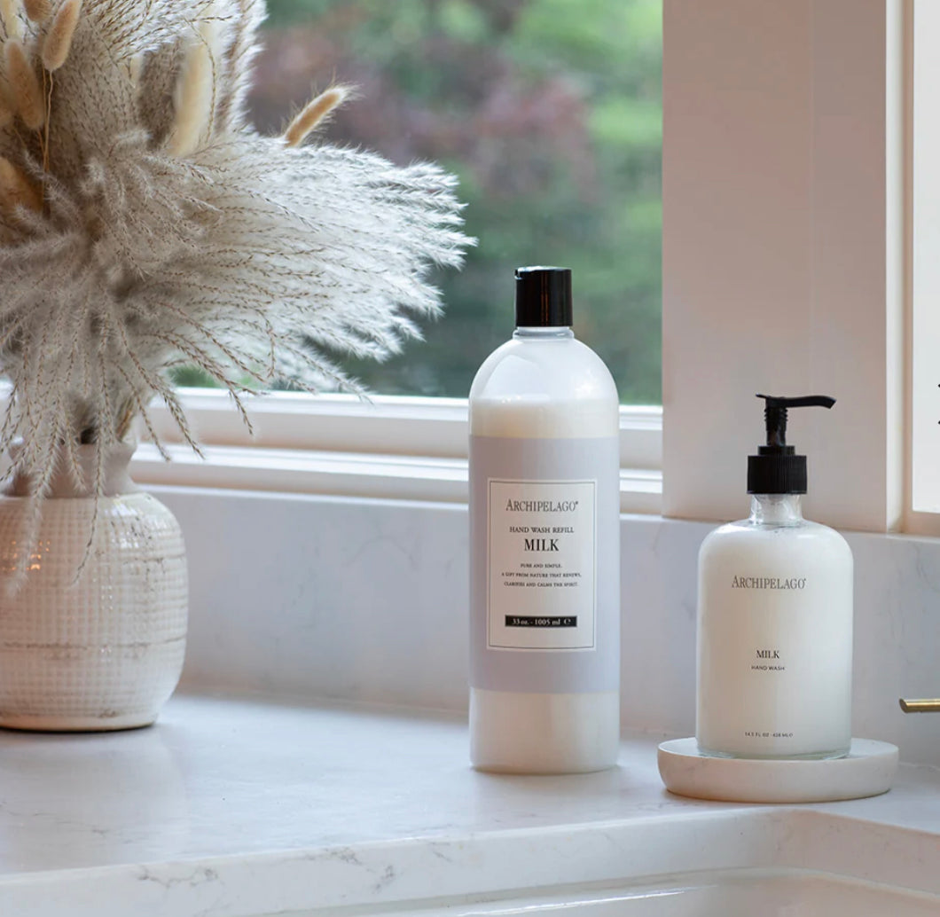 Our Milk Hand Wash is the ideal nourishing soap to keep your hands healthy and clean. Enriched with dried milk solids and natural proteins from soy, oat, and rice, this unique formula offers a nourishing experience you'll love from the very first use. The product is packaged in a recyclable glass bottle.