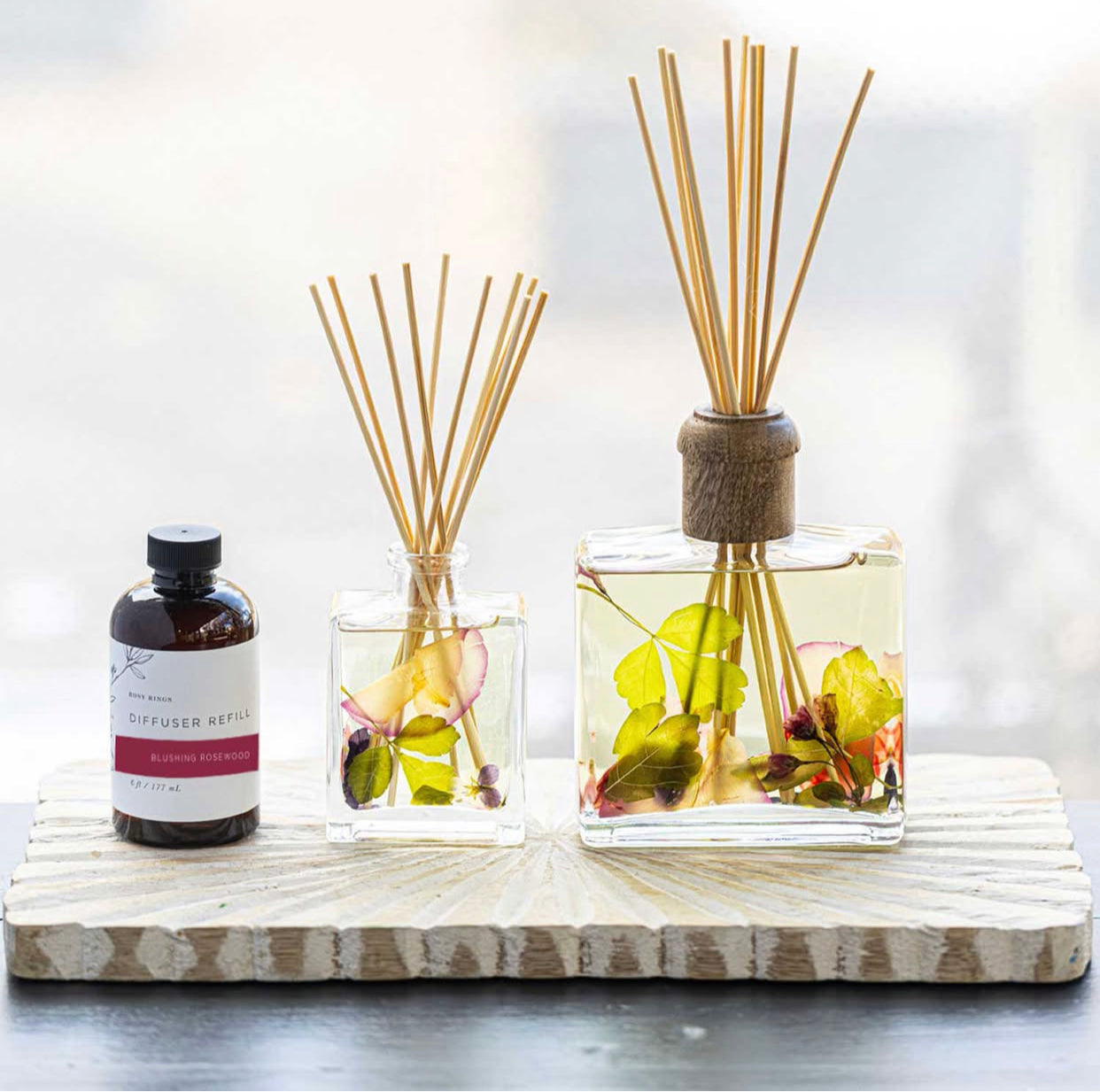 Blushing Rosewood Botanical Diffuser is a rich and captivating fragrance. The blend of Amber, Cedarwood, Oud, Rose, Oakmoss, and Peony is a sophisticated, romantic, and timeless scent we love.