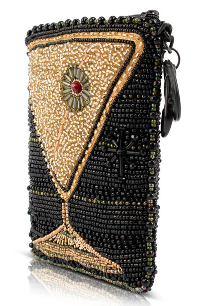 Featuring a beaded martini glass complete with a tiny olive, this glitzy little pouch is ready to party.