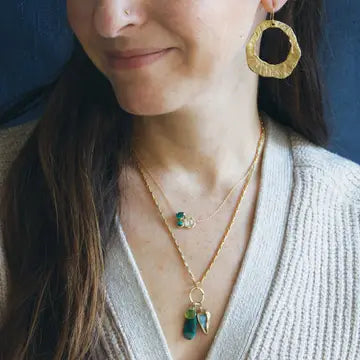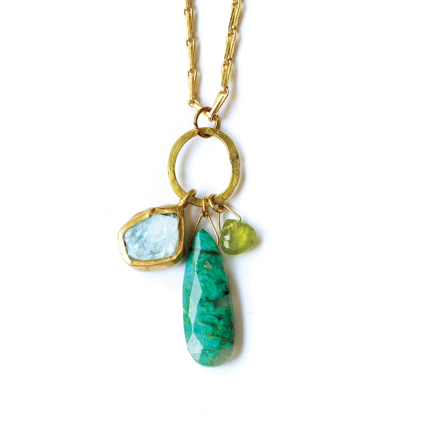A rough Aquamarine stone is embedded in Brass, and accented with two unique stones, Vesuvianite and Chrysocolla, to create this stunning pendant. Anchored on our signature chain with a handmade clasp.