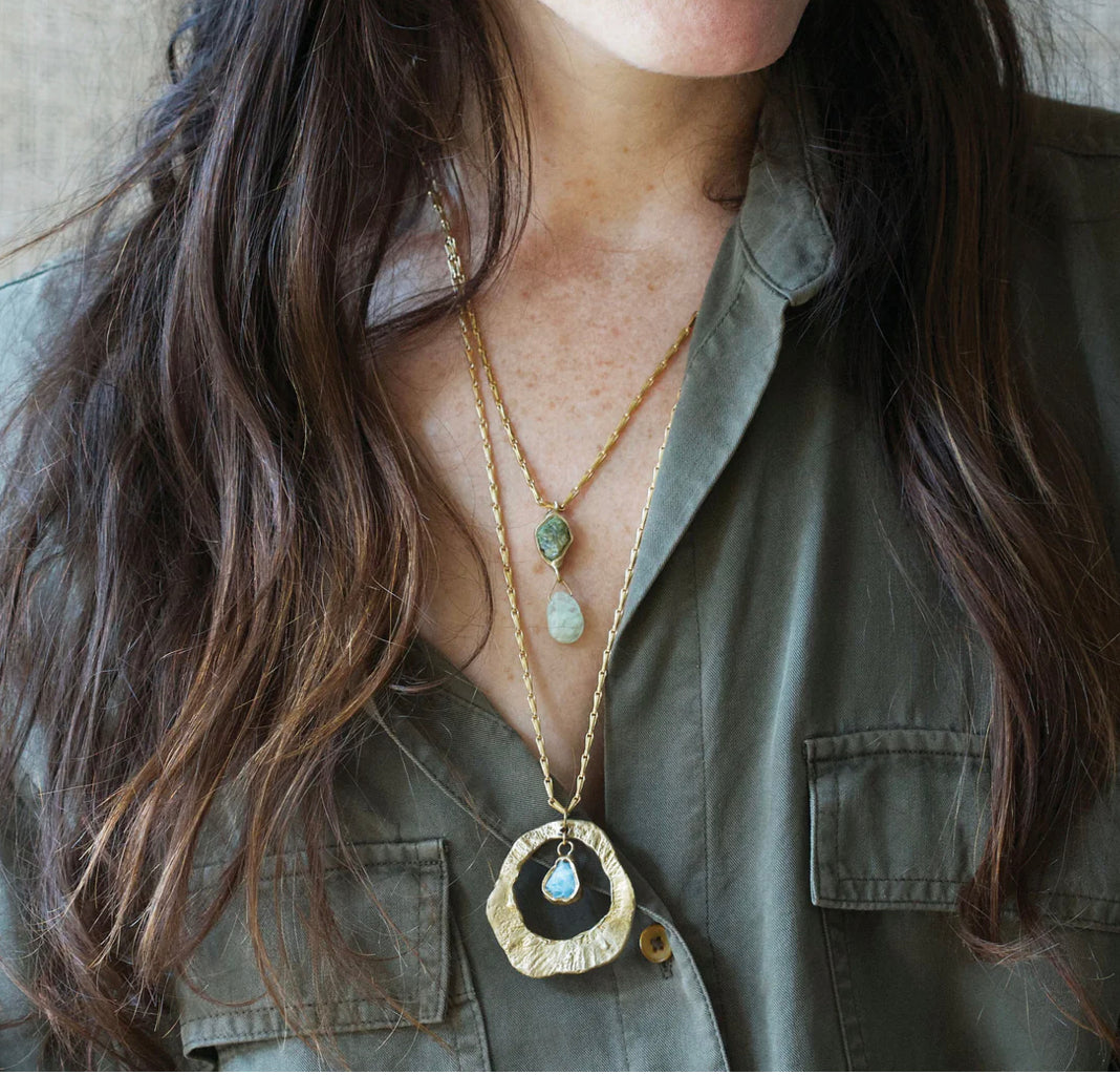 Paired with an Aquamarine embedded in Brass, this beauty hangs on our signature Brass chain with a handmade clasp.