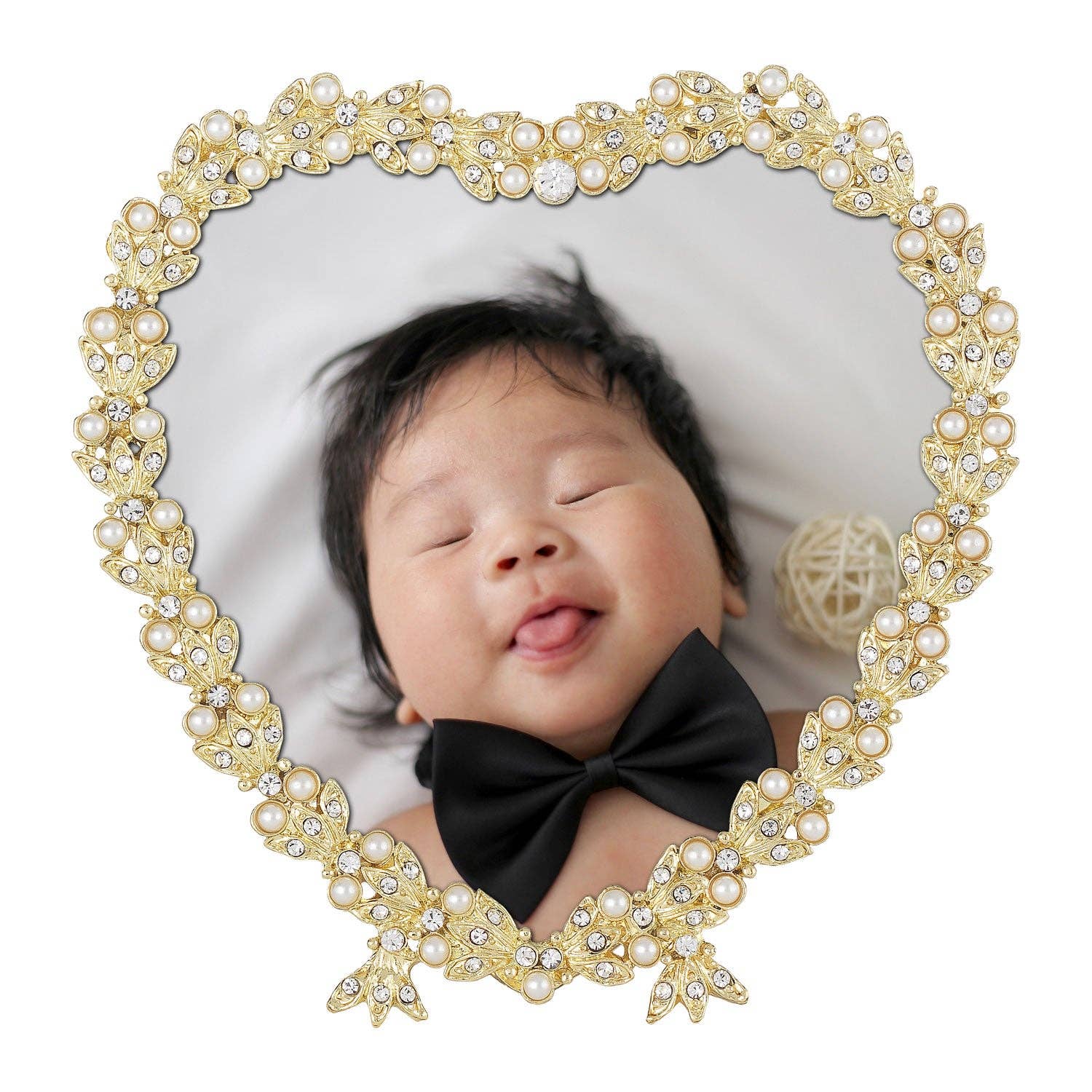 Delicate gold finished pewter heart design, adorned with hand-set clear European crystals and faux pearls.