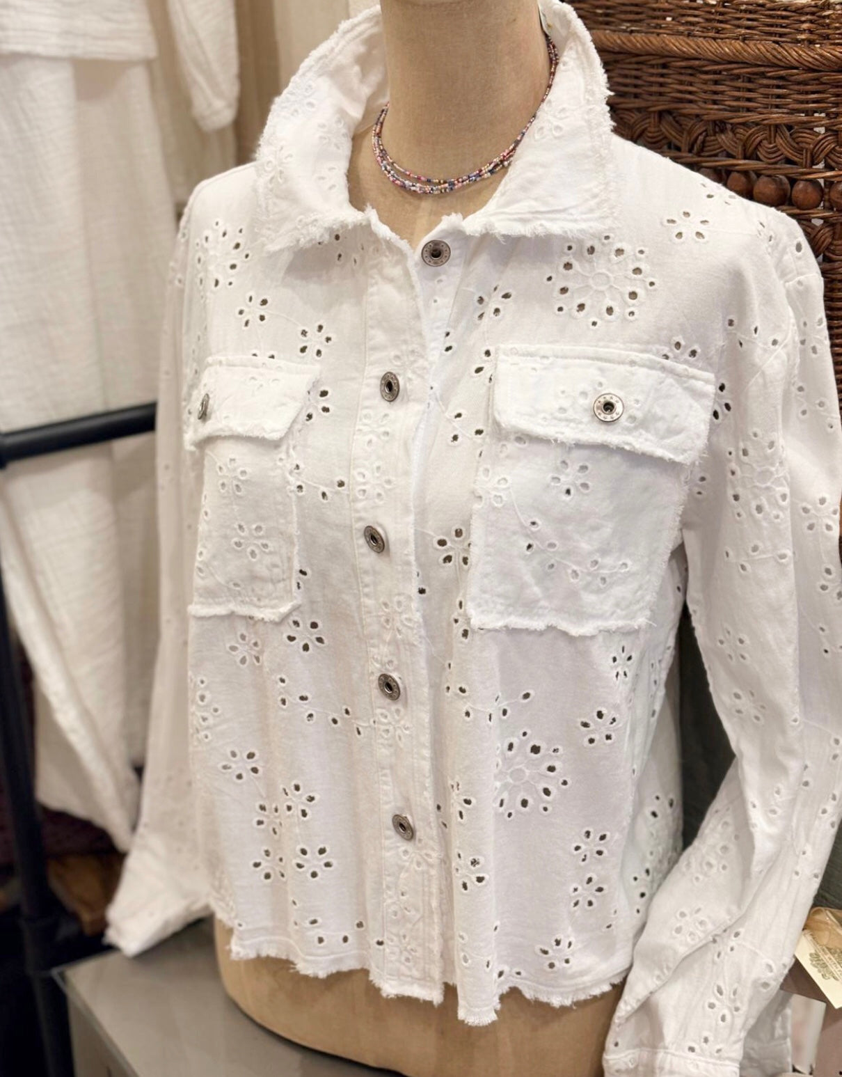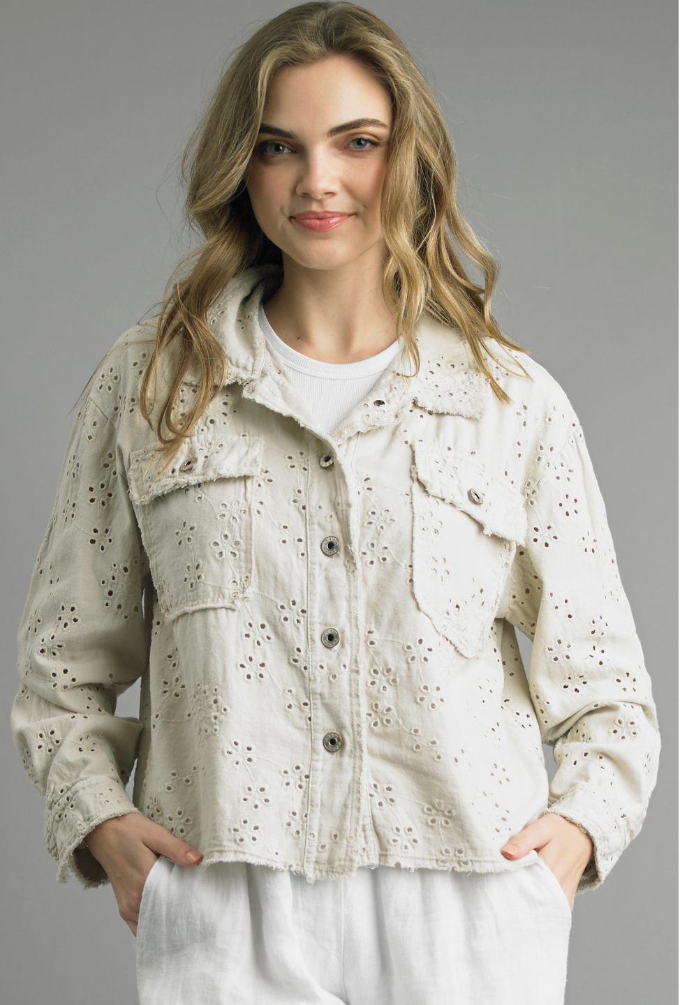 Feminine and pretty, this 100% Cotton Eyelet Jacket is lightweight and easy to wear, the perfect finishing touch for your Spring/Summer wardrobe.