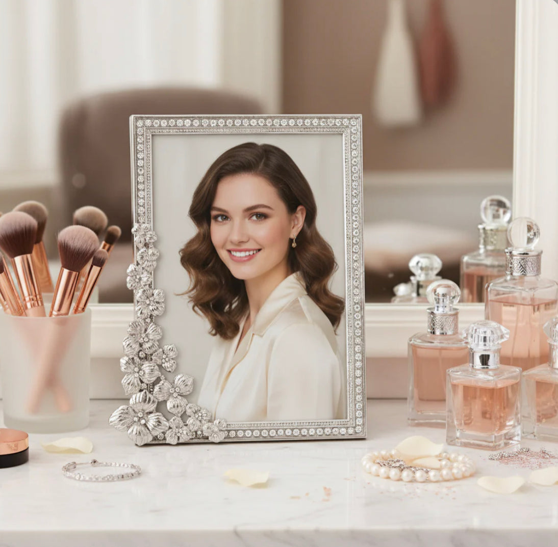 Elegant Pewter with Gold or Silver finish, bejeweled with crystals, floral accents, and beveled glass.