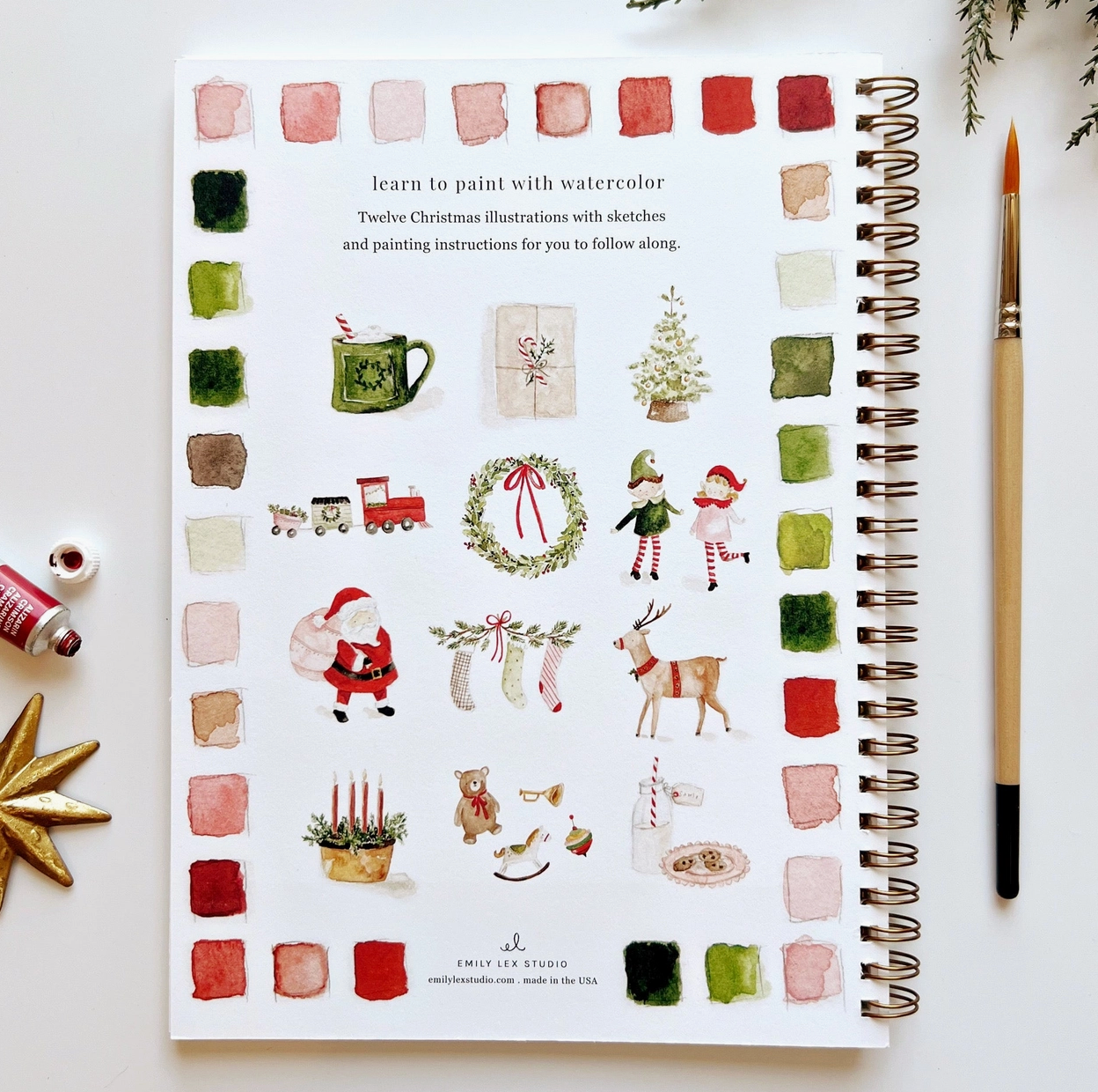 The Christmas Watercolor Workbook includes 12 Christmas-themed illustrations with an example of the finished painting, step-by-step instructions, and a lightly illustrated sketch for you to paint.