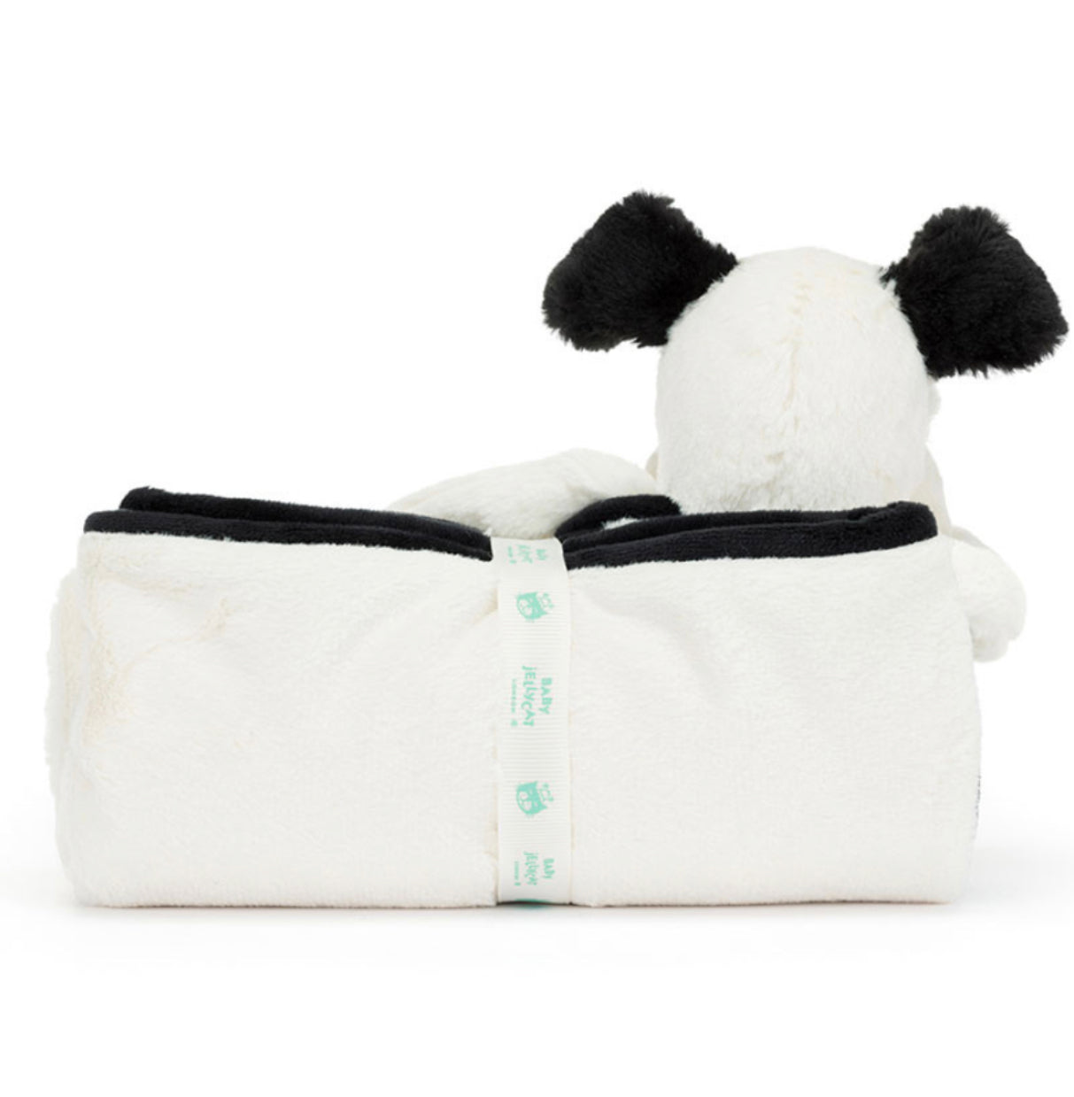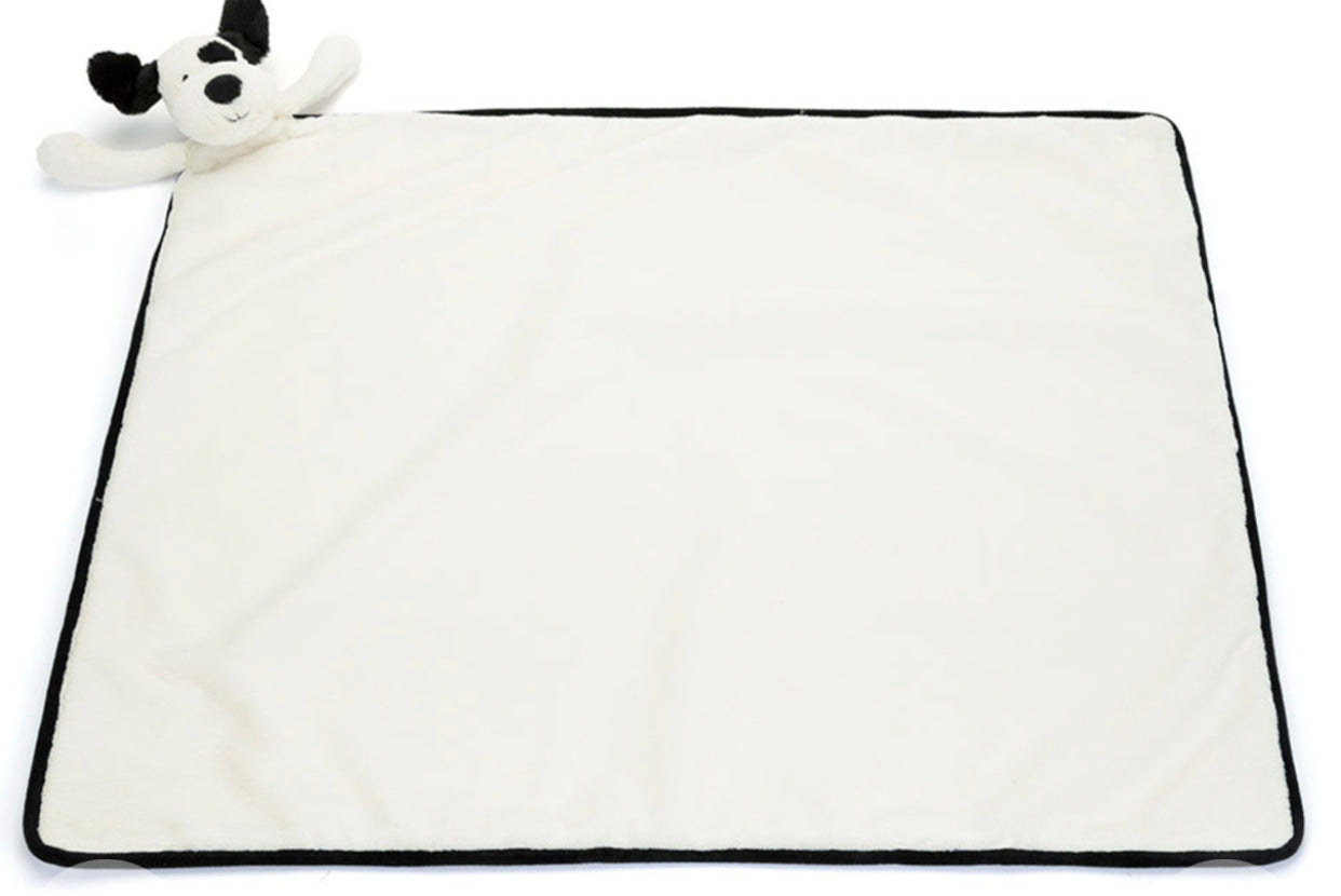 Made for cuddles, Jellycat Bashful Black and Cream Puppy Blankie is designed for little paws to hold tight.