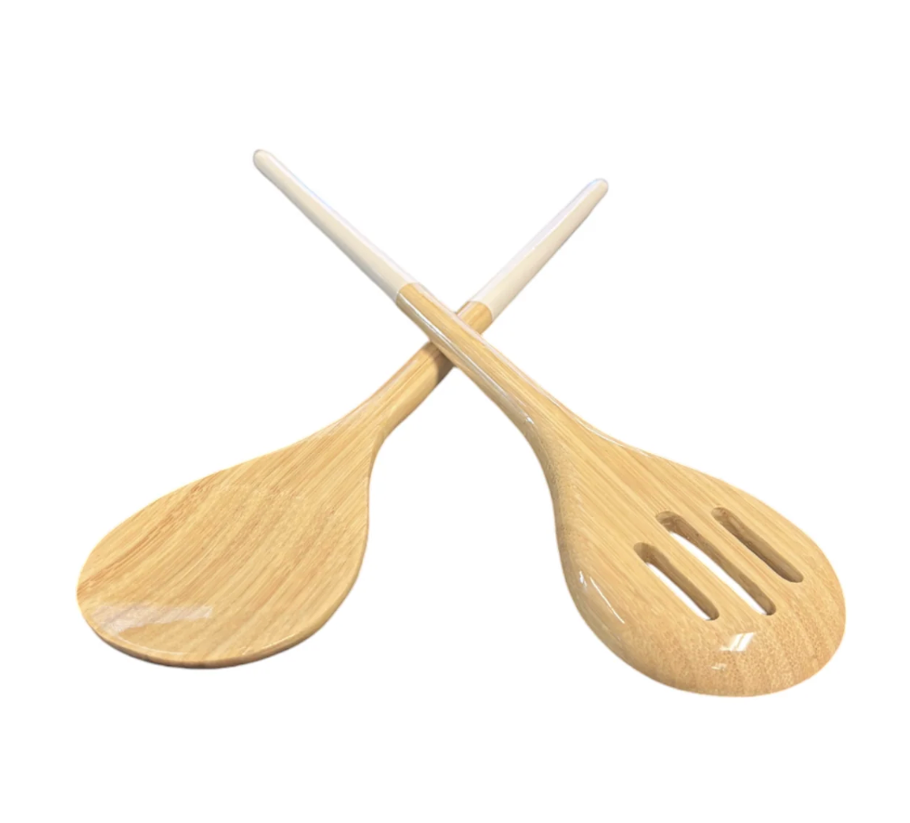A modern set of Bamboo Salad Servers, with a polished high gloss finish and sleek design.
