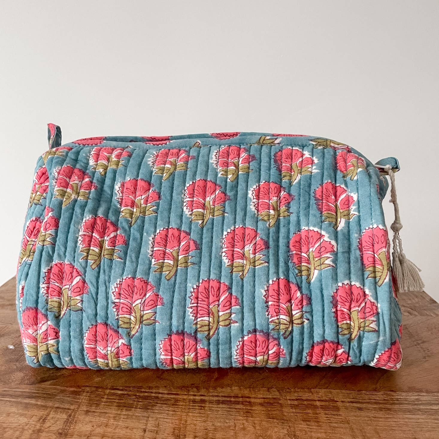 Generously-sized block printed pouches are made from 100% Quilted Cotton, and are perfect for carrying cosmetics, brushes, toiletries, jewelry.