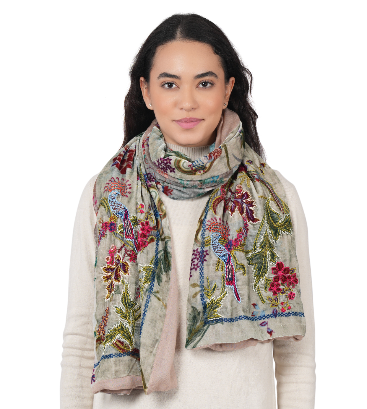 This exquisite piece features vibrant botanical and bird motifs, beautifully highlighted with embroidery that adds texture, shimmer and depth to every detail.