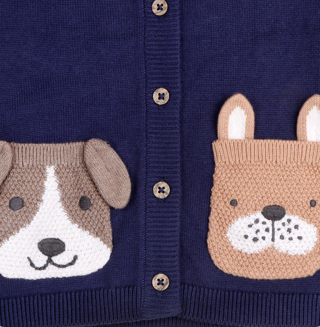 100% Organic Cotton with 2 adorable puppy pockets on front.